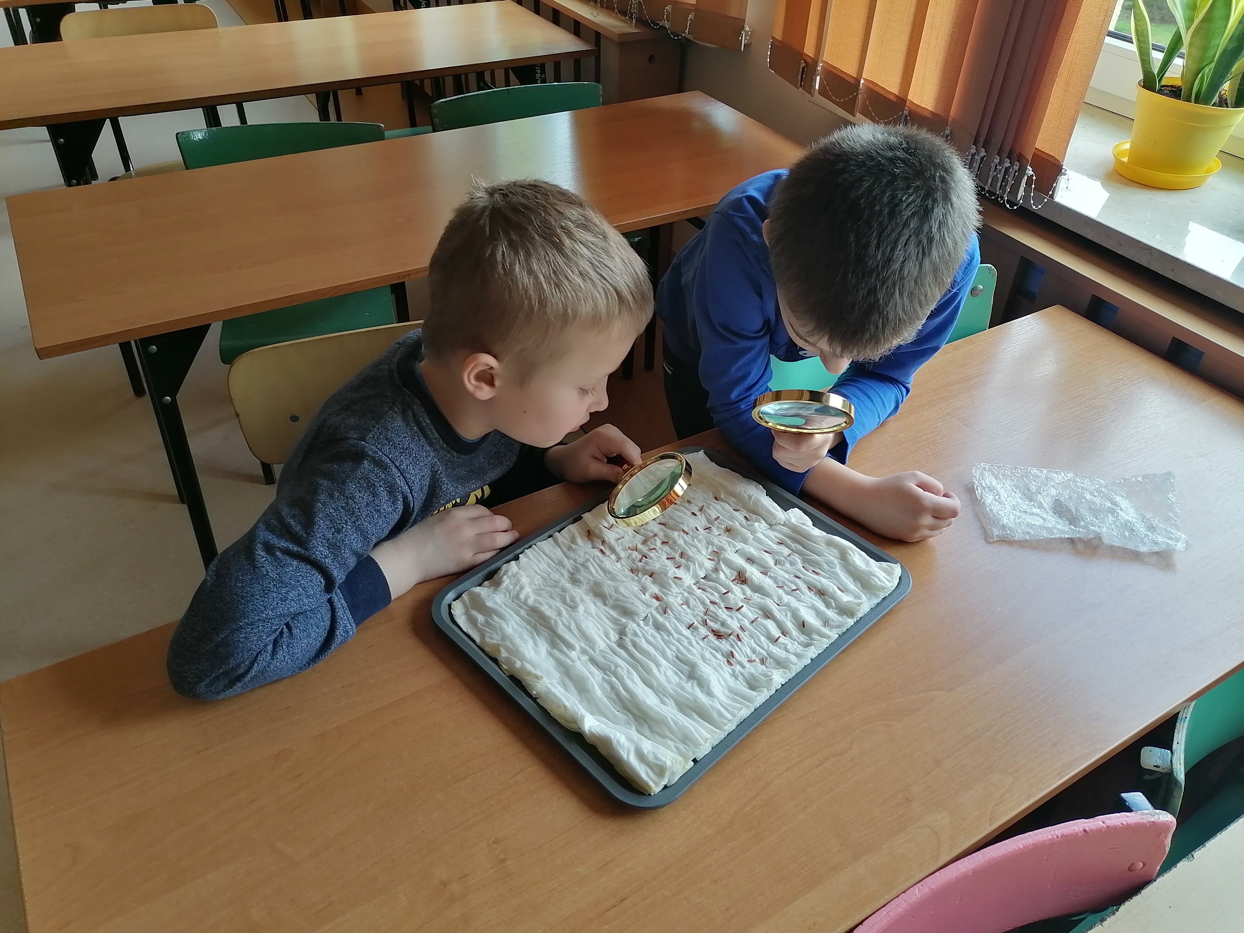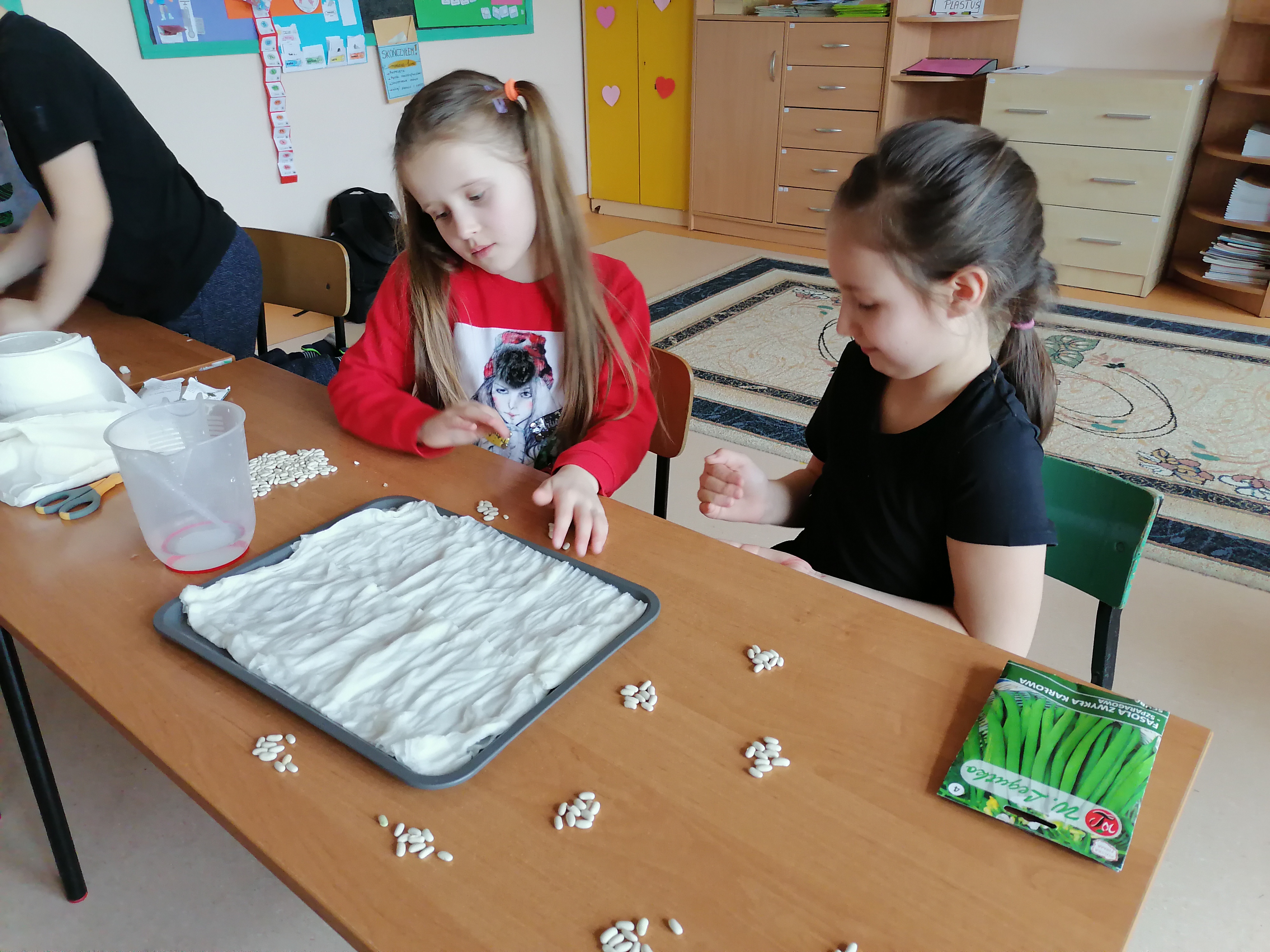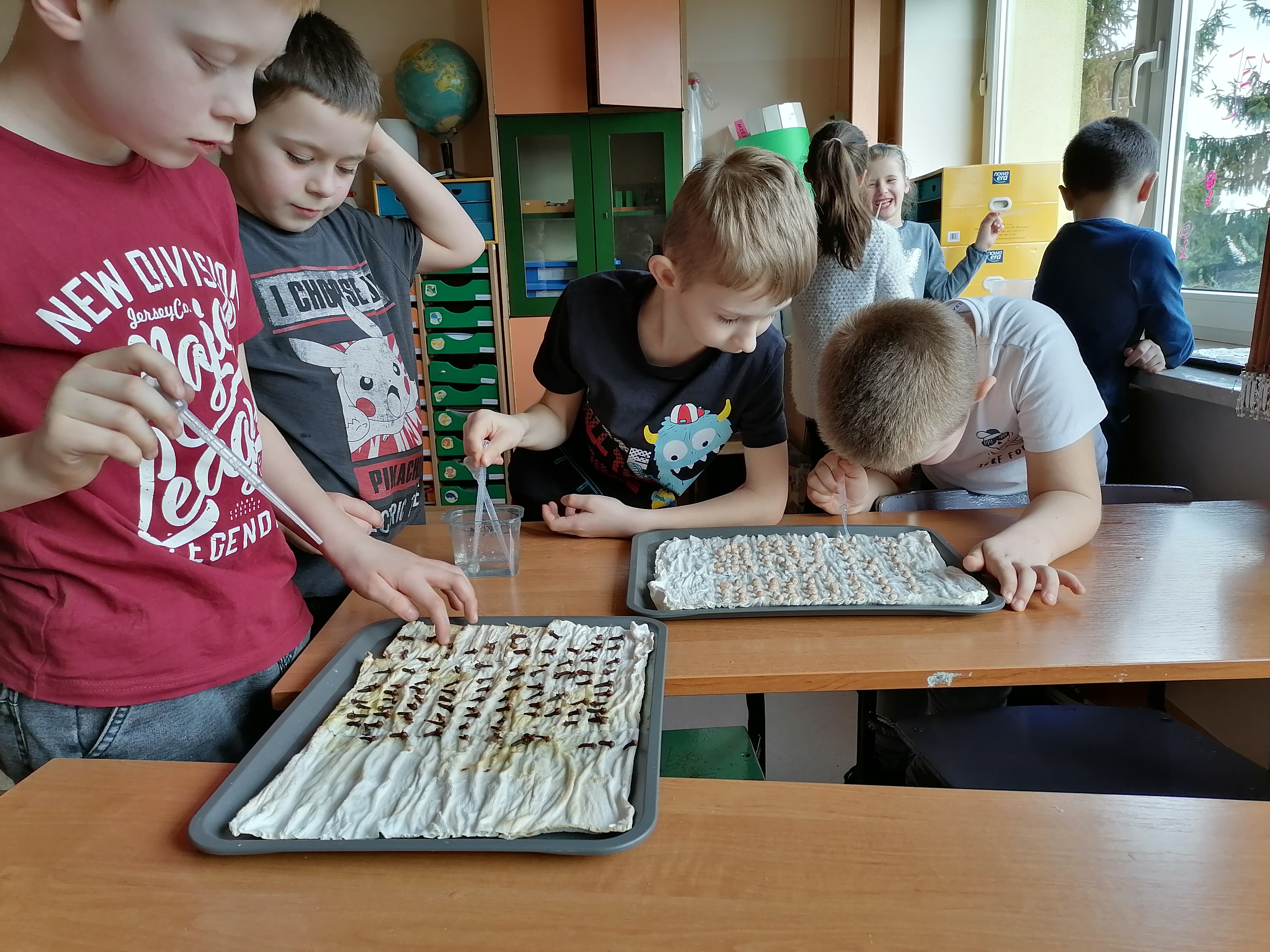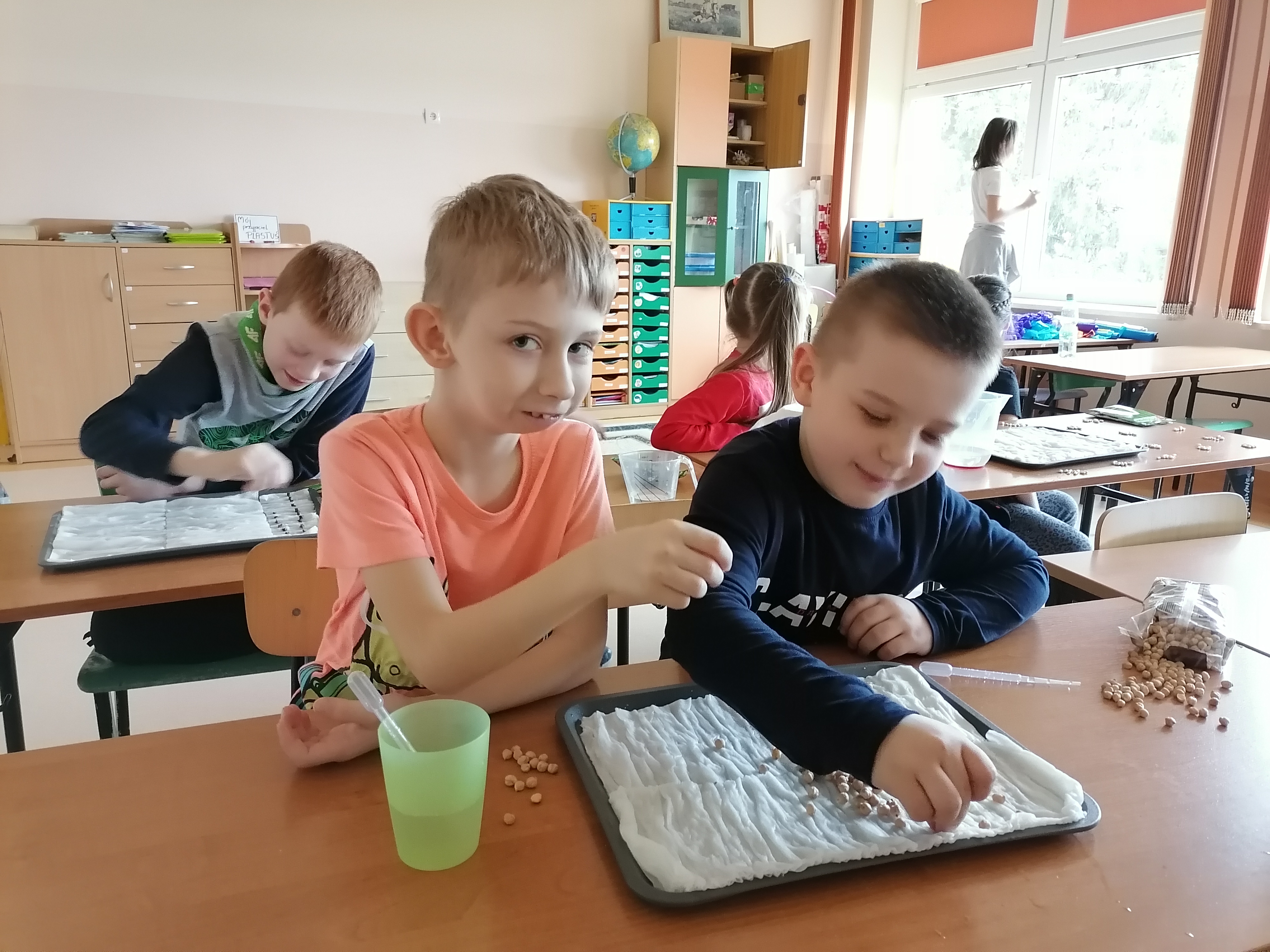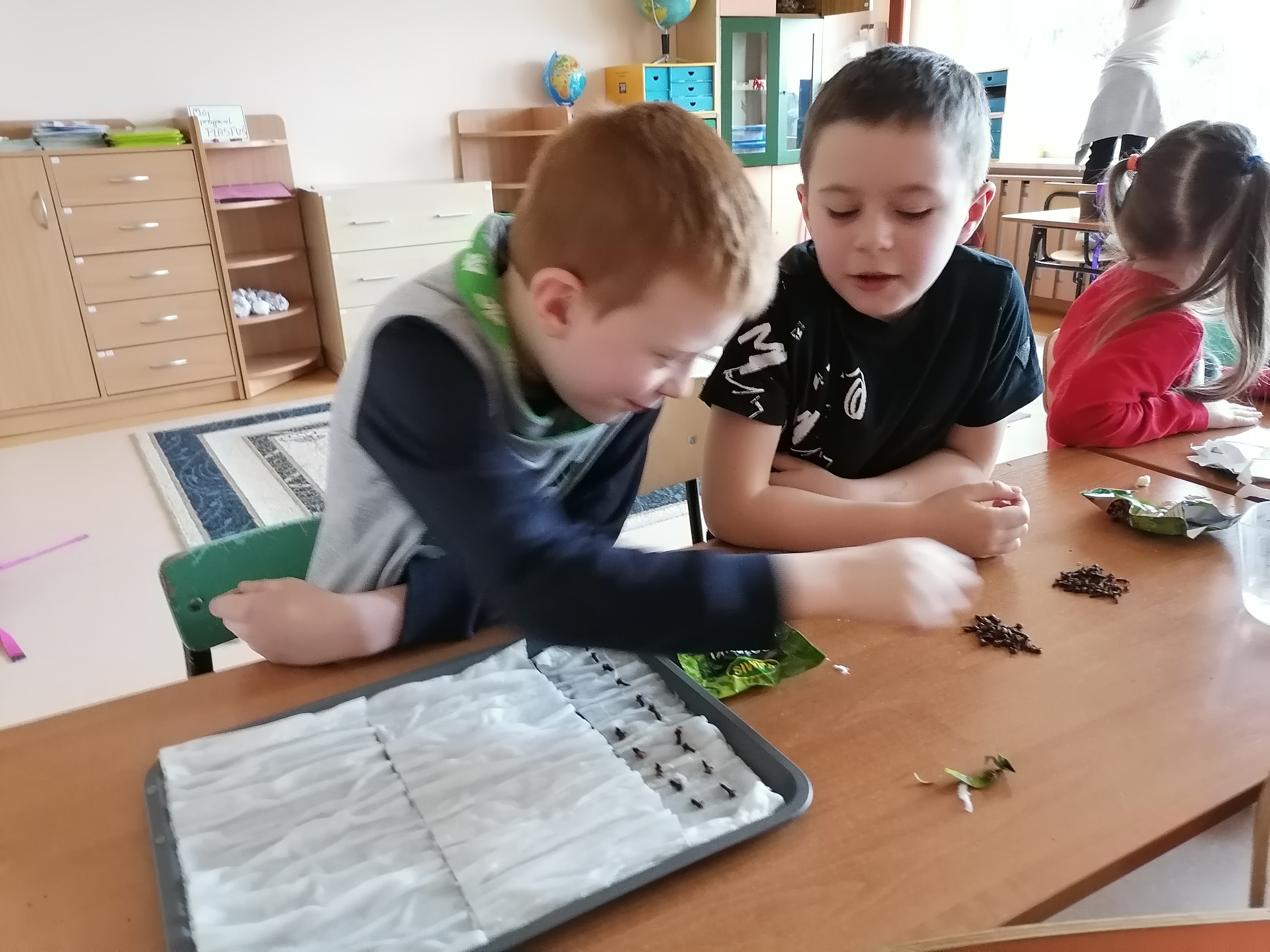 Pierwszoklasiści, którzy realizowali projekt po etapie przygotowawczym i omówieniu wszelkich aspektów ochoczo przystąpili do pracy. Wspólnie ustaliliśmy, które z dostępnych produktów spożywczych poddamy badaniom zdolności kiełkowania. W naszym przypadku padło na fasolę, ciecierzycę, ryż i goździki. Uczniowie dobrali się w pary i każda para odpowiedzialna była za swoją próbę. Wybrany koordynator czuwał nad wszystkim i pomagał w miarę potrzeb. Od tej pory każda para odpowiedzialna była za swoją tacę z idealnie odliczonymi nasionami. Swoją drogą bardzo ciekawe były techniki liczenia i weryfikacji poprawności odpowiedniej ilości nasion. Dla Pierwszaków zakładanie doświadczenia było bardzo emocjonujące. Od tej pory zgodnie z założeniami przez tydzień prowadziliśmy obserwację i regularnie podlewaliśmy nasiona. Niestety nie przewidzieliśmy, że lignina tak szybko będzie wysychała i w ciągu weekendu nasiona przesuszyły się. Konieczna była modyfikacja doświadczenia. Nasze próby przykryliśmy folią. Gdy nasiona miały zapewnioną odpowiednią wilgotność, zaczęły wypuszczać pierwsze kiełki. Zarówno obserwacje jak i karty podlewania uzupełniane były przez uczniów na bieżąco.