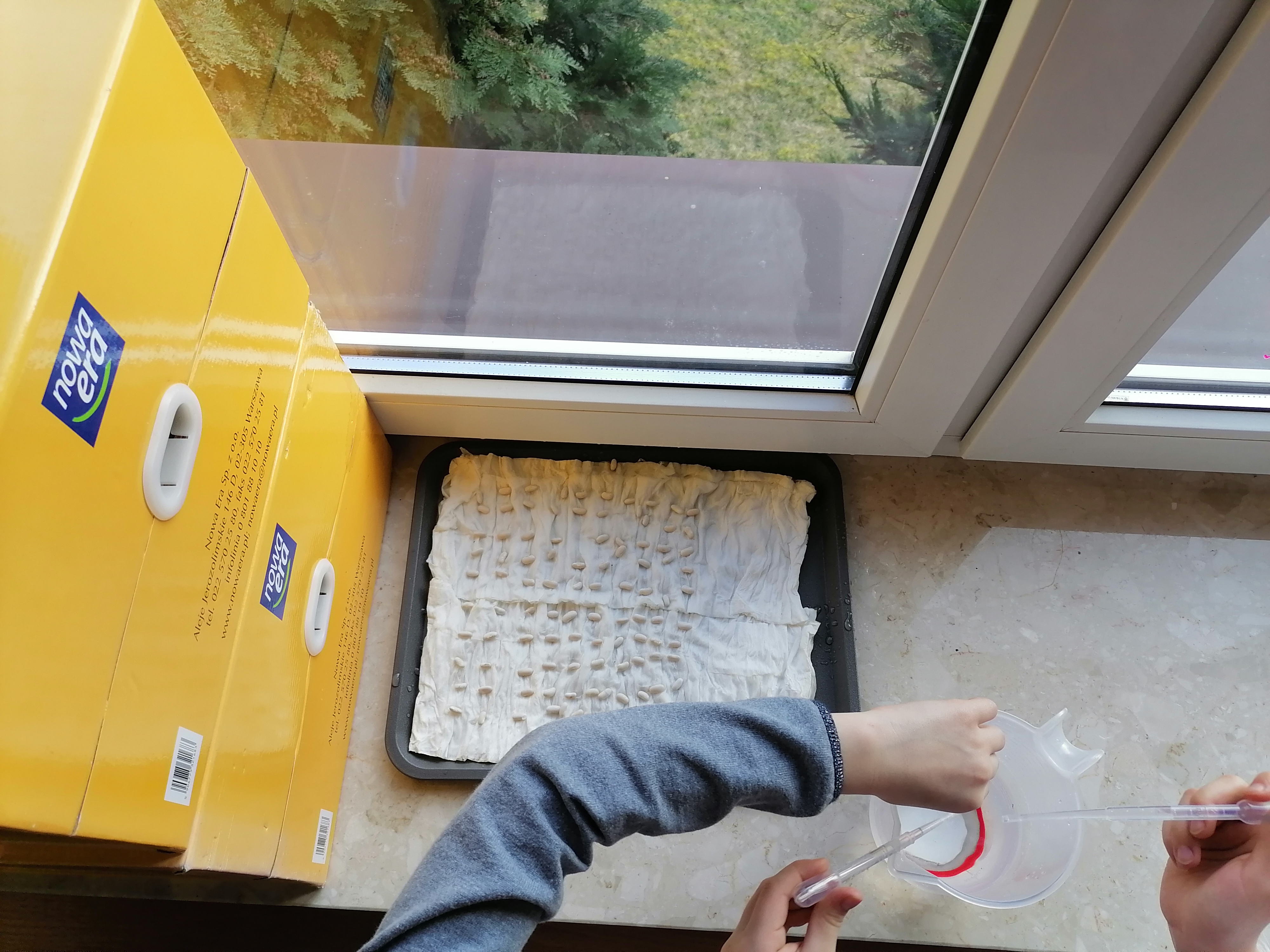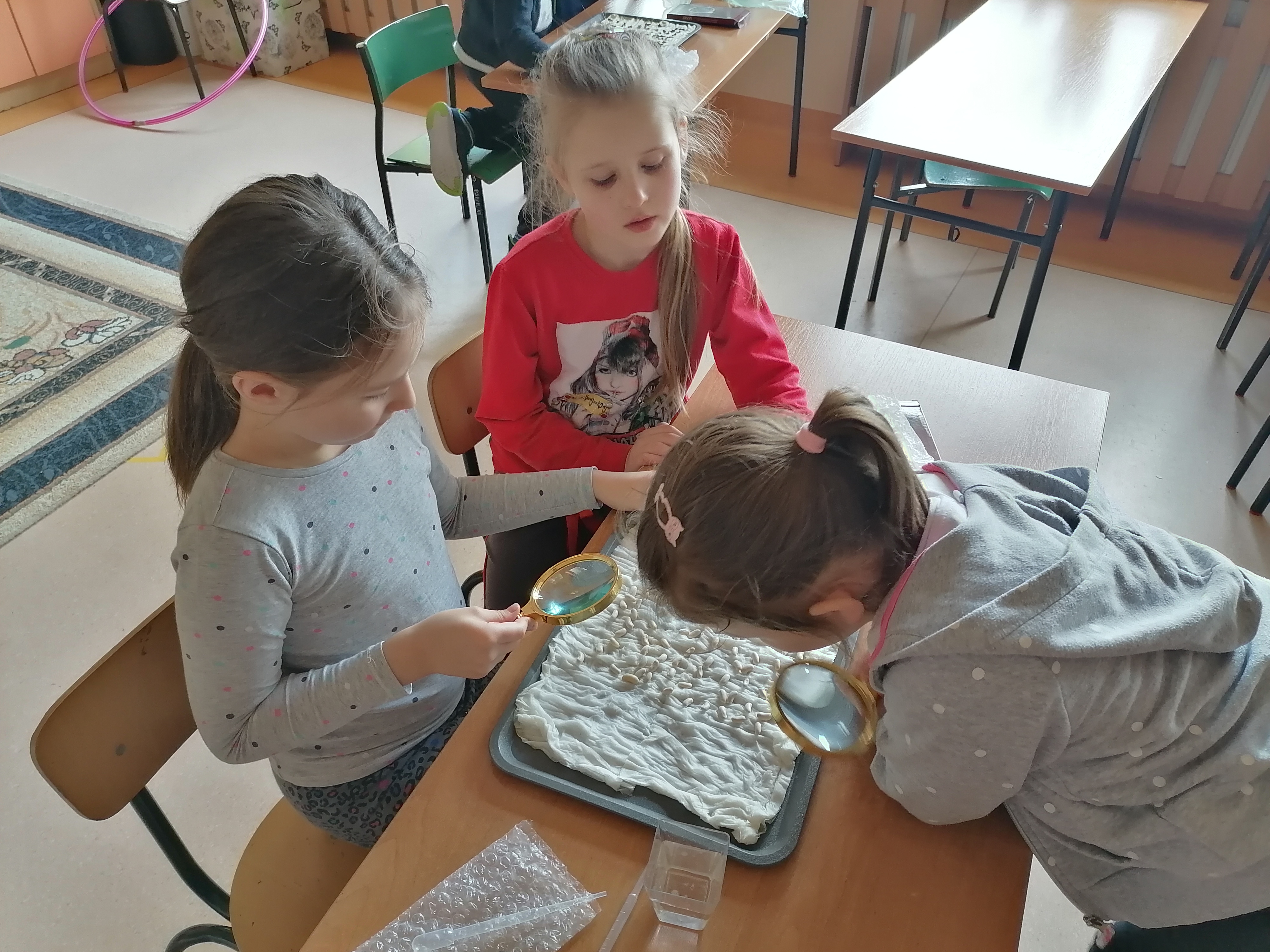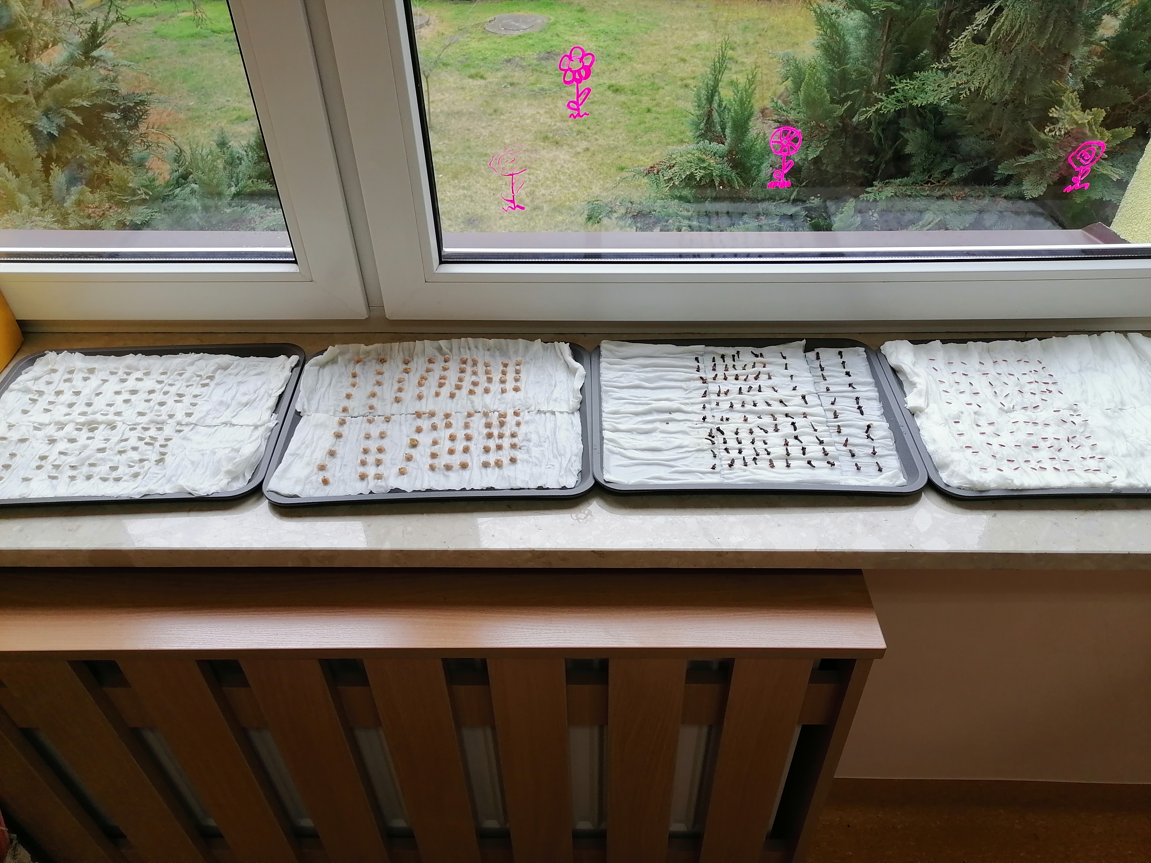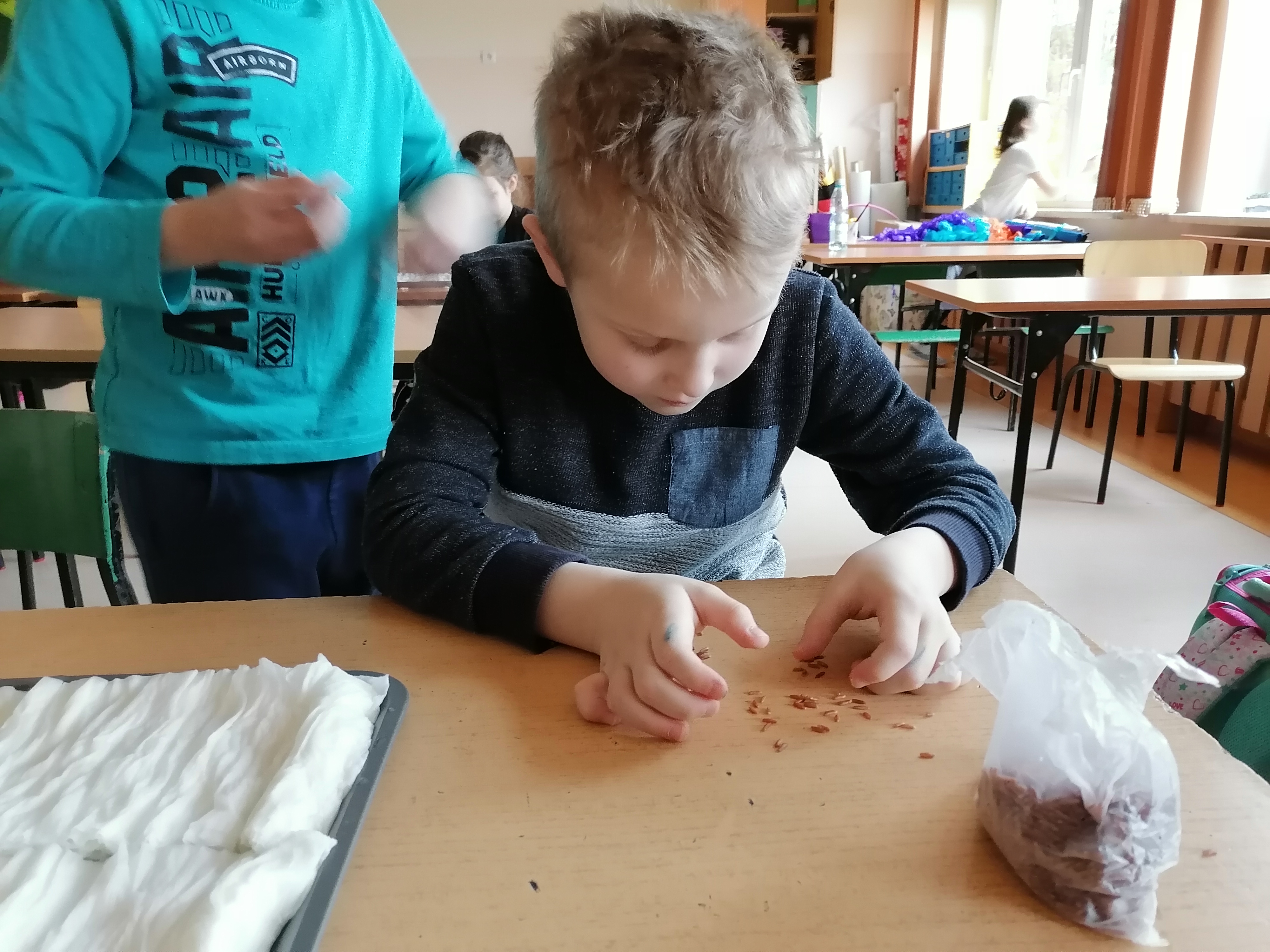 Pierwszoklasiści, którzy realizowali projekt po etapie przygotowawczym i omówieniu wszelkich aspektów ochoczo przystąpili do pracy. Wspólnie ustaliliśmy, które z dostępnych produktów spożywczych poddamy badaniom zdolności kiełkowania. W naszym przypadku padło na fasolę, ciecierzycę, ryż i goździki. Uczniowie dobrali się w pary i każda para odpowiedzialna była za swoją próbę. Wybrany koordynator czuwał nad wszystkim i pomagał w miarę potrzeb. Od tej pory każda para odpowiedzialna była za swoją tacę z idealnie odliczonymi nasionami. Swoją drogą bardzo ciekawe były techniki liczenia i weryfikacji poprawności odpowiedniej ilości nasion. Dla Pierwszaków zakładanie doświadczenia było bardzo emocjonujące. Od tej pory zgodnie z założeniami przez tydzień prowadziliśmy obserwację i regularnie podlewaliśmy nasiona. Niestety nie przewidzieliśmy, że lignina tak szybko będzie wysychała i w ciągu weekendu nasiona przesuszyły się. Konieczna była modyfikacja doświadczenia. Nasze próby przykryliśmy folią. Gdy nasiona miały zapewnioną odpowiednią wilgotność, zaczęły wypuszczać pierwsze kiełki. Zarówno obserwacje jak i karty podlewania uzupełniane były przez uczniów na bieżąco.