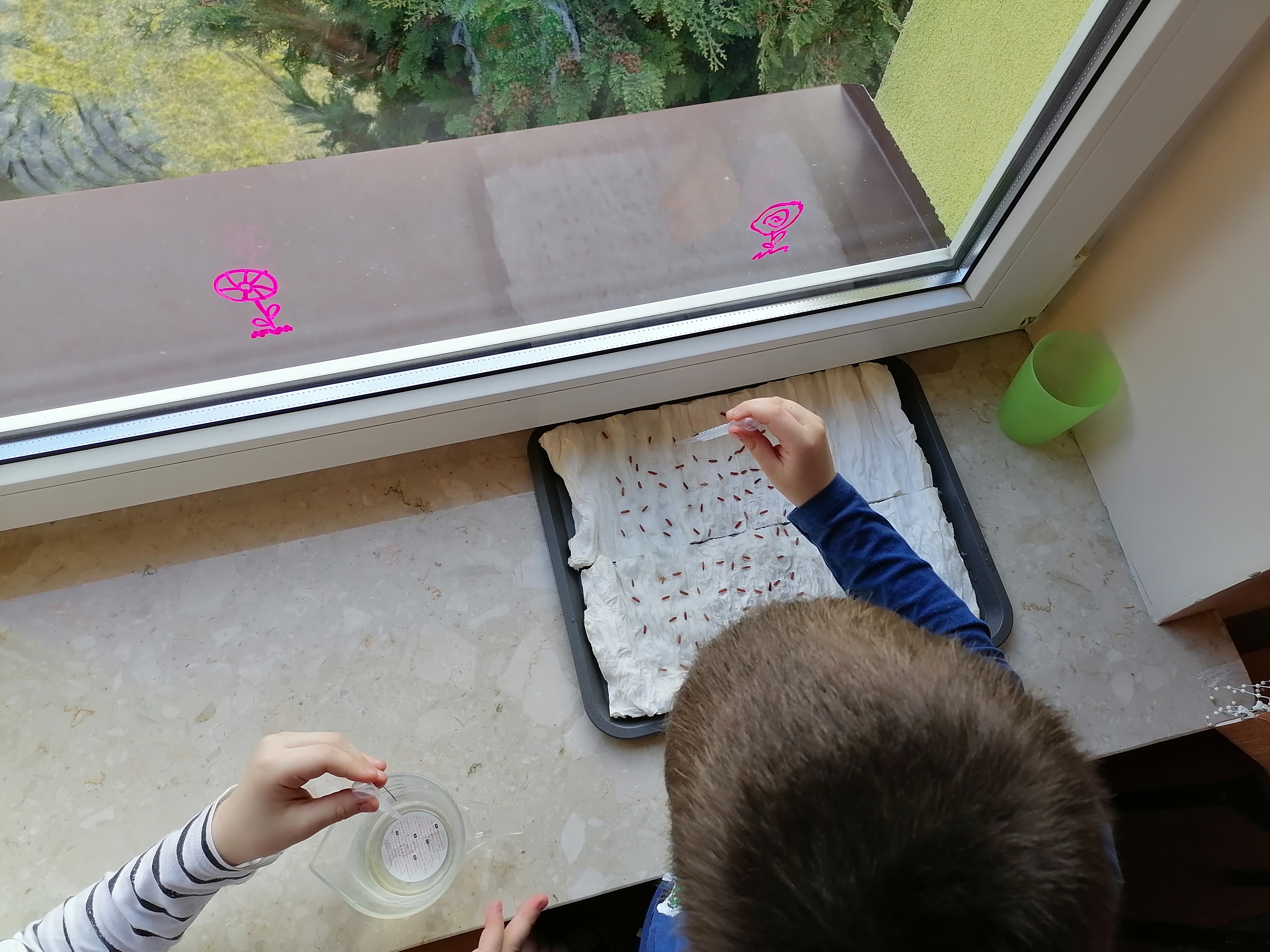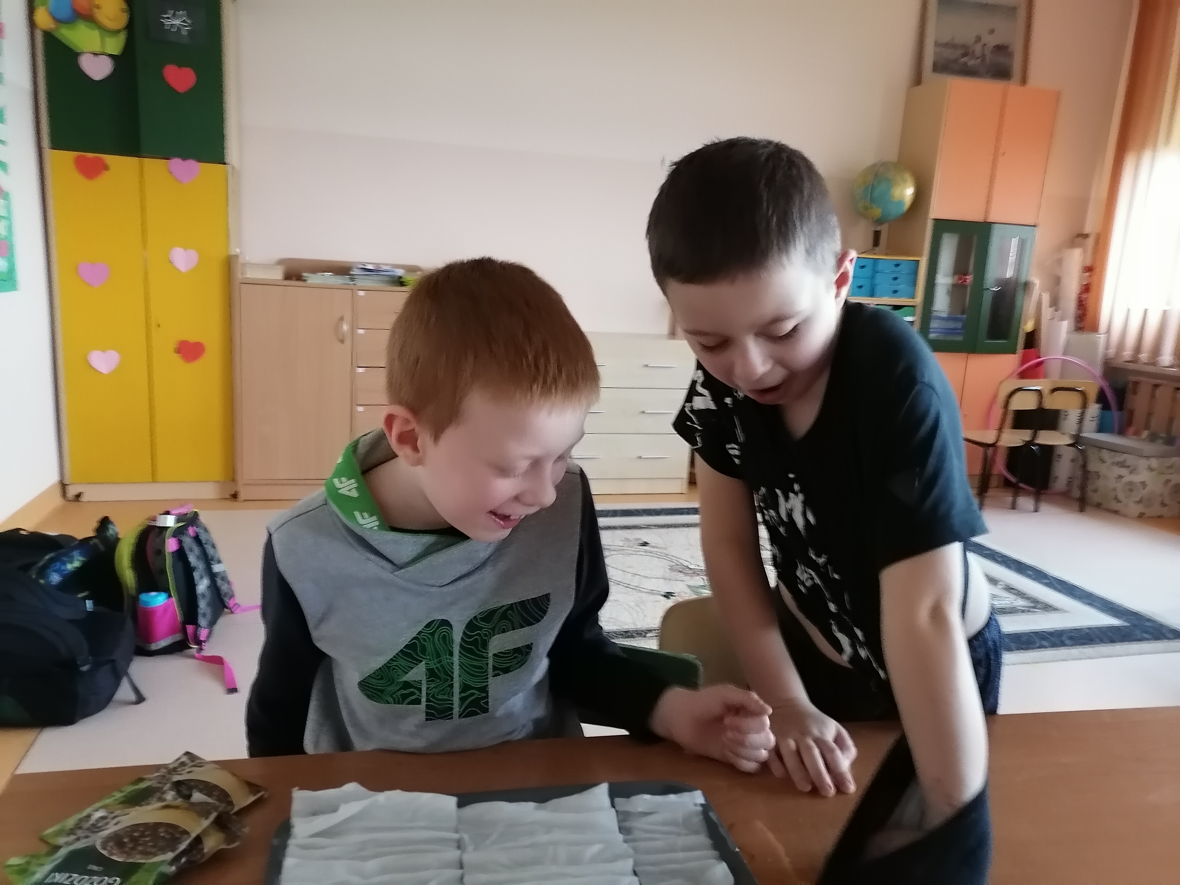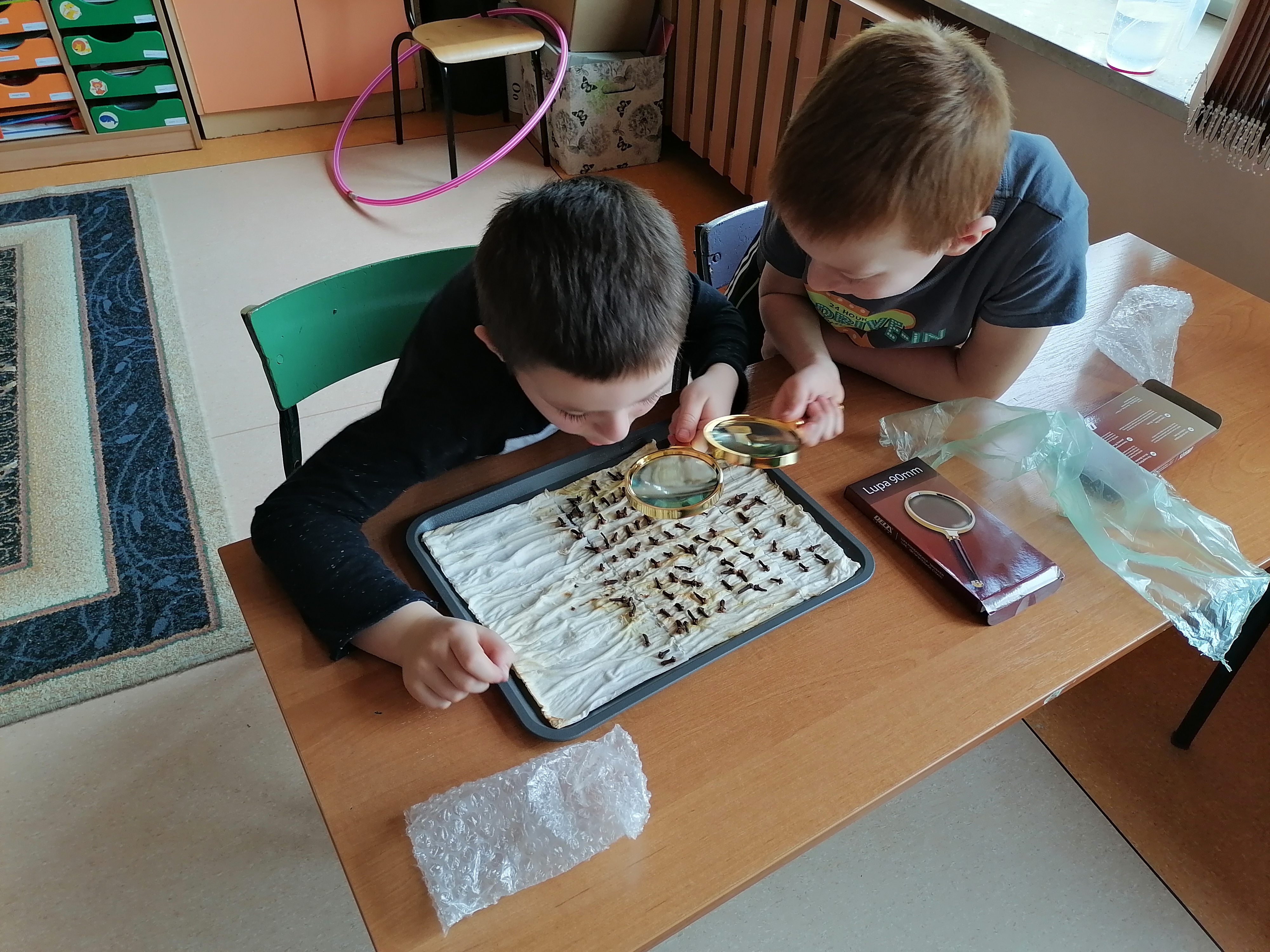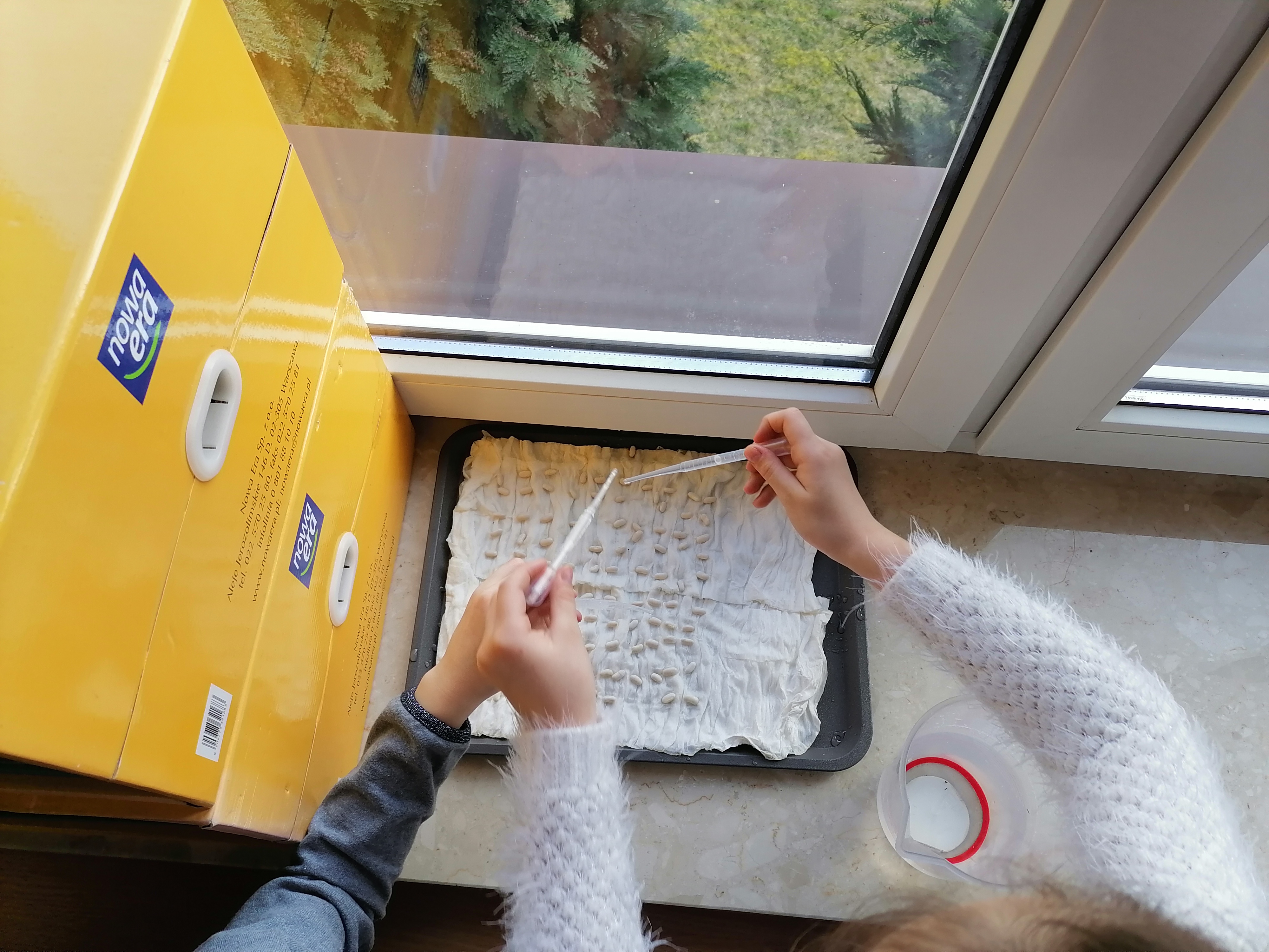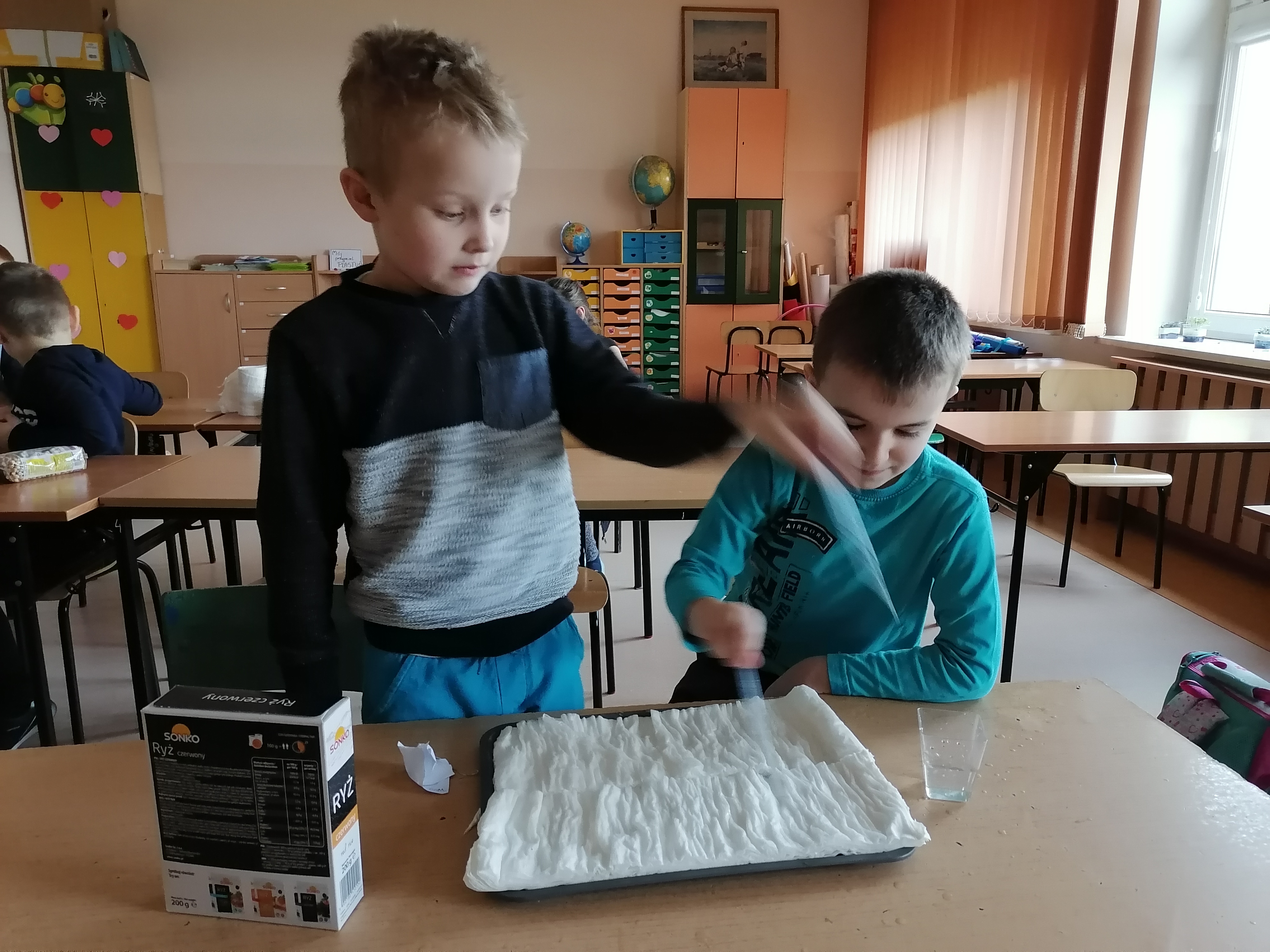Pierwszoklasiści, którzy realizowali projekt po etapie przygotowawczym i omówieniu wszelkich aspektów ochoczo przystąpili do pracy. Wspólnie ustaliliśmy, które z dostępnych produktów spożywczych poddamy badaniom zdolności kiełkowania. W naszym przypadku padło na fasolę, ciecierzycę, ryż i goździki. Uczniowie dobrali się w pary i każda para odpowiedzialna była za swoją próbę. Wybrany koordynator czuwał nad wszystkim i pomagał w miarę potrzeb. Od tej pory każda para odpowiedzialna była za swoją tacę z idealnie odliczonymi nasionami. Swoją drogą bardzo ciekawe były techniki liczenia i weryfikacji poprawności odpowiedniej ilości nasion. Dla Pierwszaków zakładanie doświadczenia było bardzo emocjonujące. Od tej pory zgodnie z założeniami przez tydzień prowadziliśmy obserwację i regularnie podlewaliśmy nasiona. Niestety nie przewidzieliśmy, że lignina tak szybko będzie wysychała i w ciągu weekendu nasiona przesuszyły się. Konieczna była modyfikacja doświadczenia. Nasze próby przykryliśmy folią. Gdy nasiona miały zapewnioną odpowiednią wilgotność, zaczęły wypuszczać pierwsze kiełki. Zarówno obserwacje jak i karty podlewania uzupełniane były przez uczniów na bieżąco.