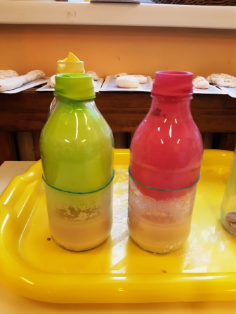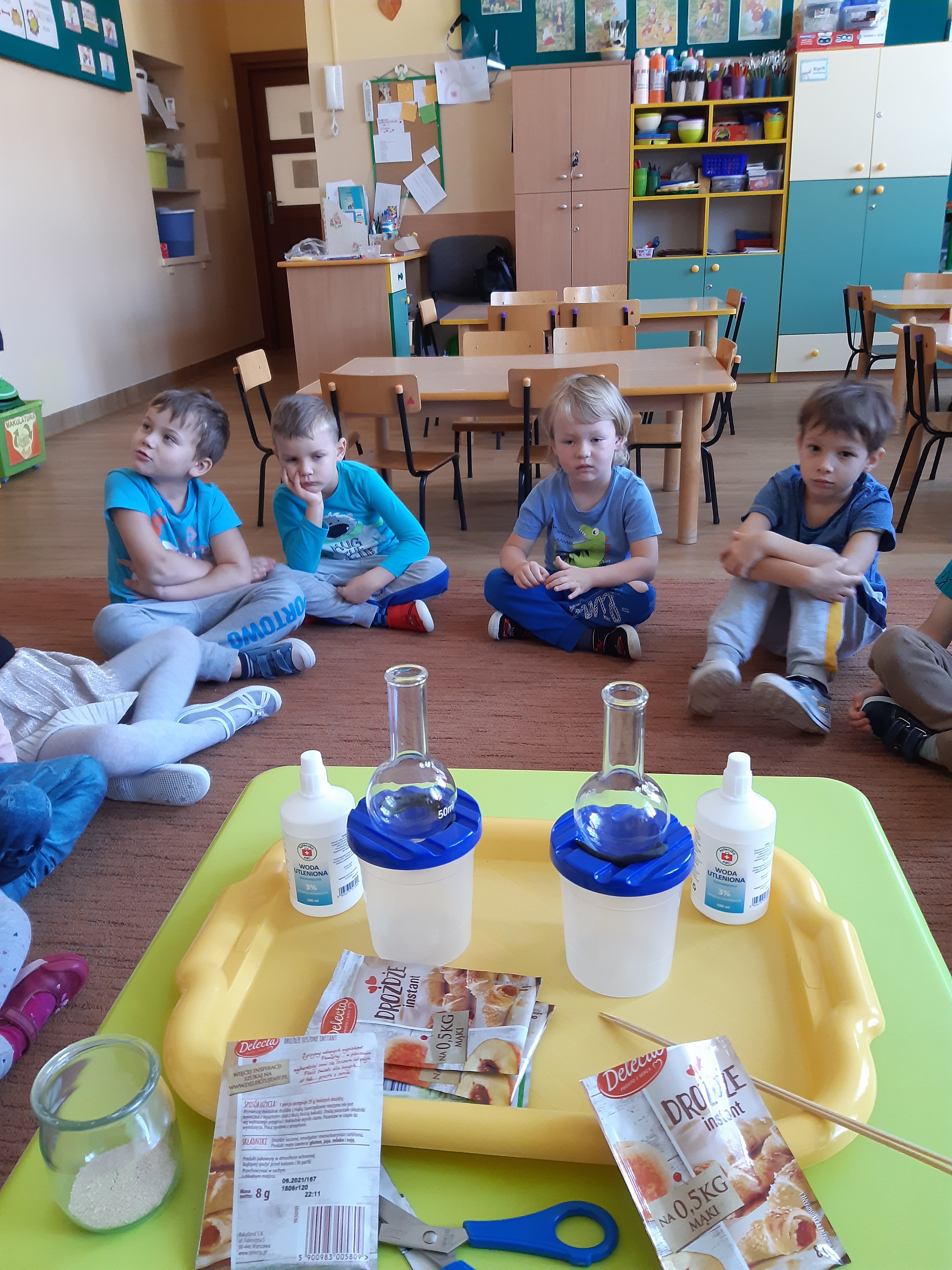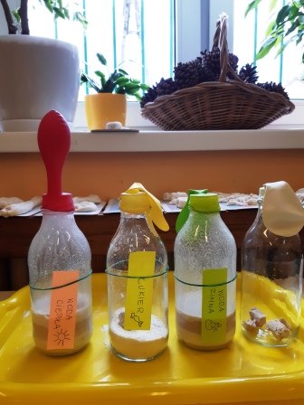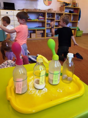 Do szklanych butelek wsypaliśmy cukier, dodaliśmy drożdży i do jednej z butelek ciepłej ,a do drugiej zimnej wody na butelki zamiast zakrętki nałożyliśmy balony. Butelka z ciepłą wodą szybko napompowała balon a ta z zimną wodą – trzeba było długo czekać i balon był zdecydowanie mniejszy, ale obydwa wypełniły się dwutlenkiem węgla . W butelkach widoczne były również pęcherzyki na drożdżach.