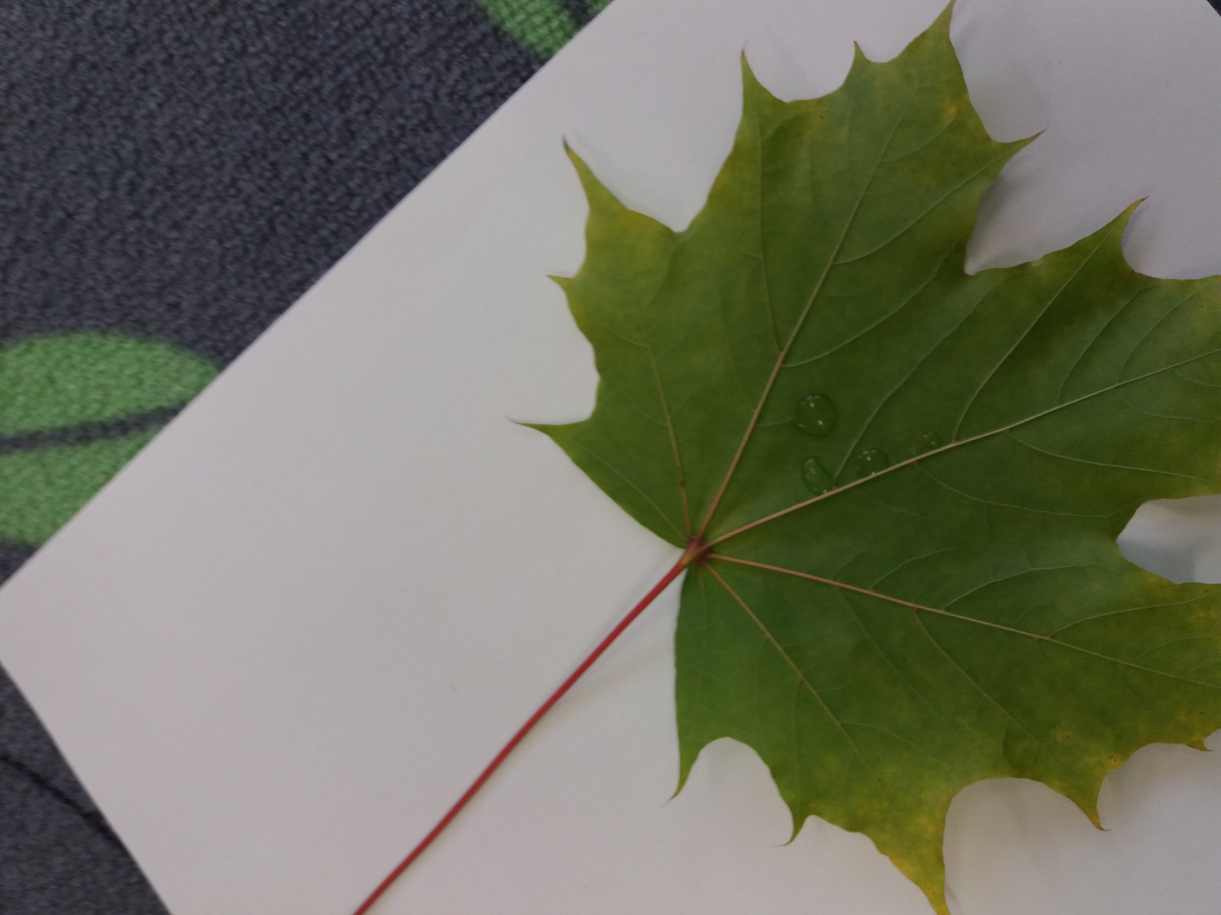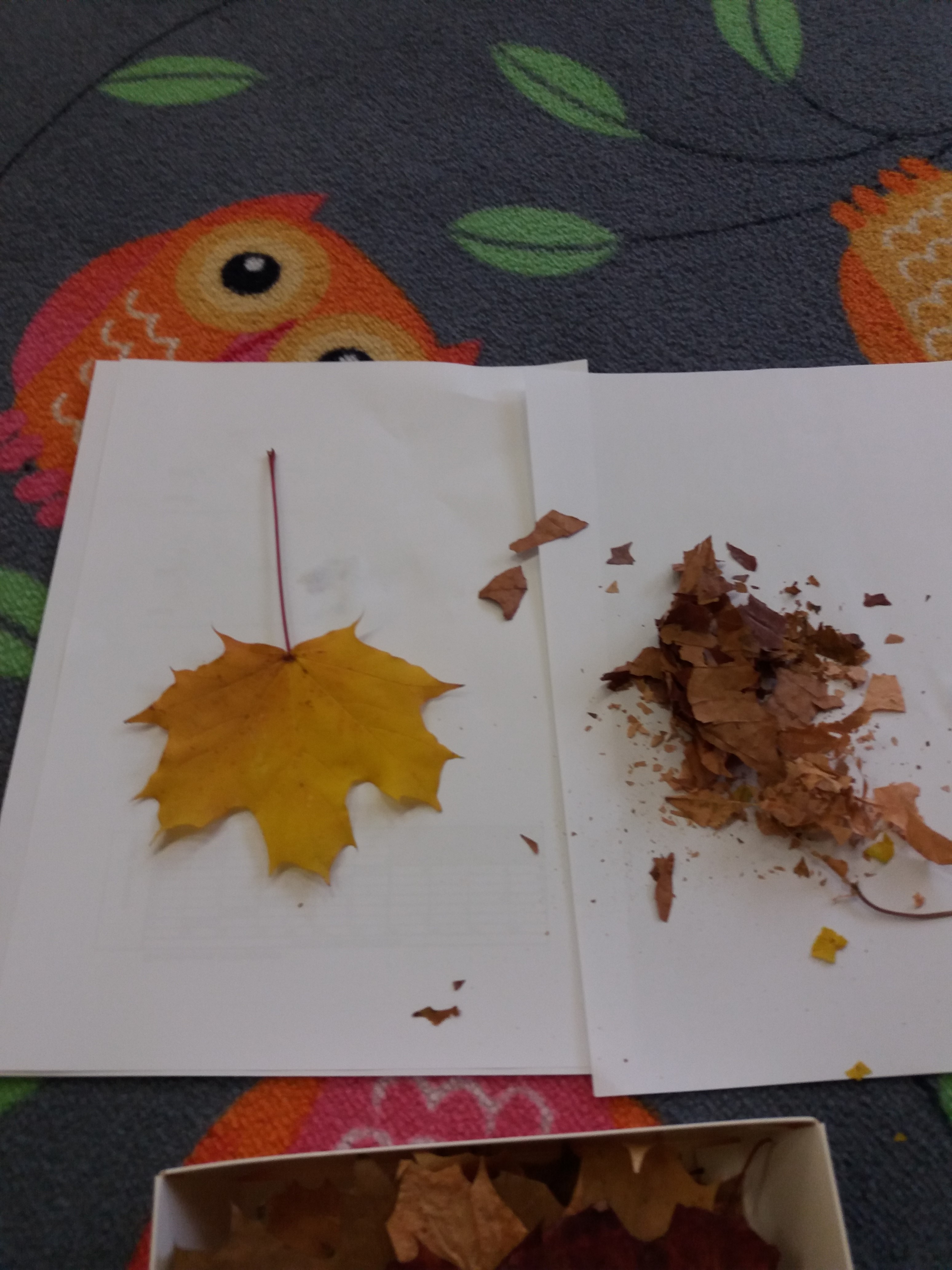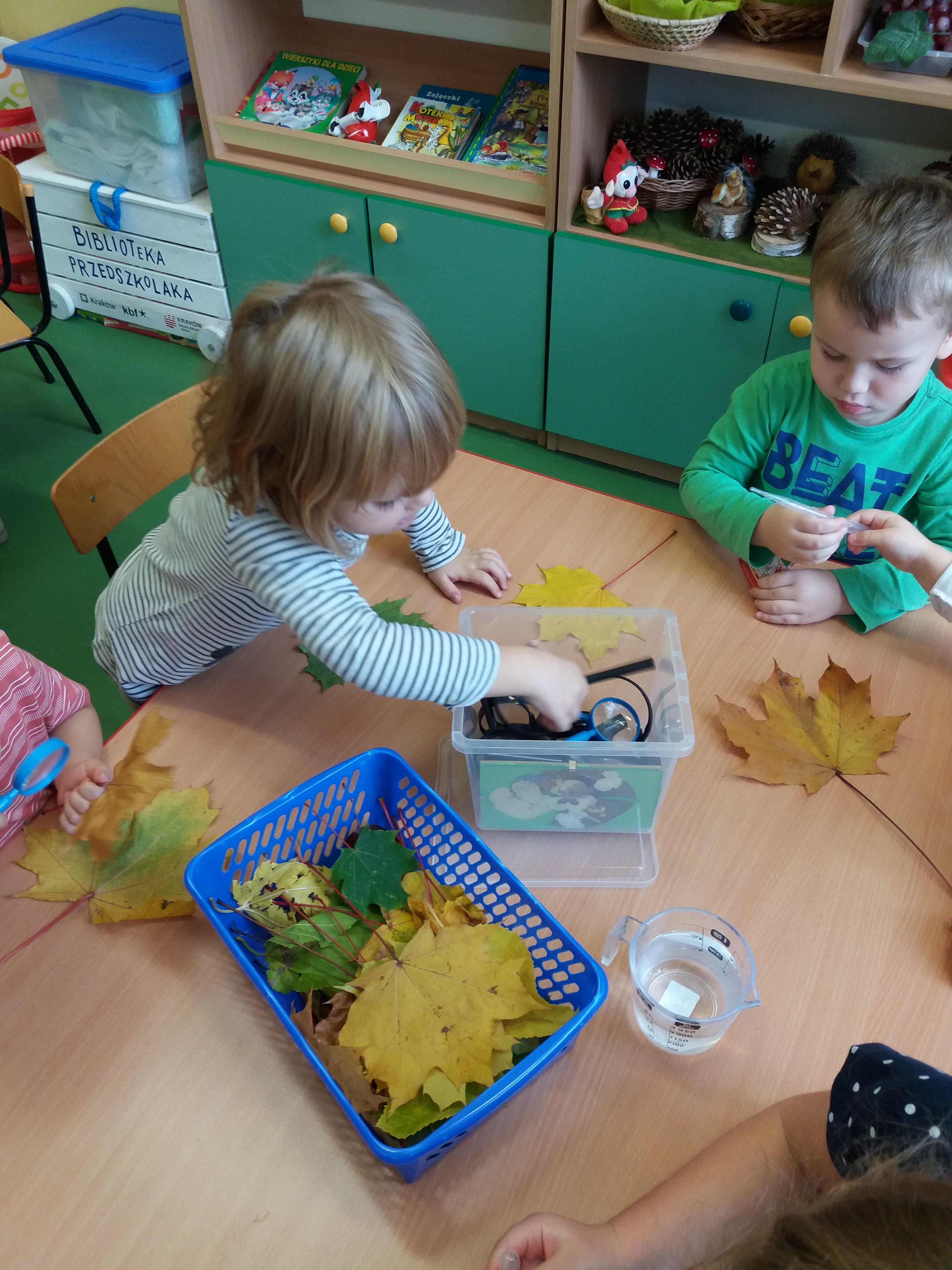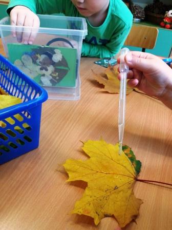 Eksperymentowaliśmy, jak zachowa się liść w kontakcie z wodą, pod wpływem nacisku oraz zgniatania.