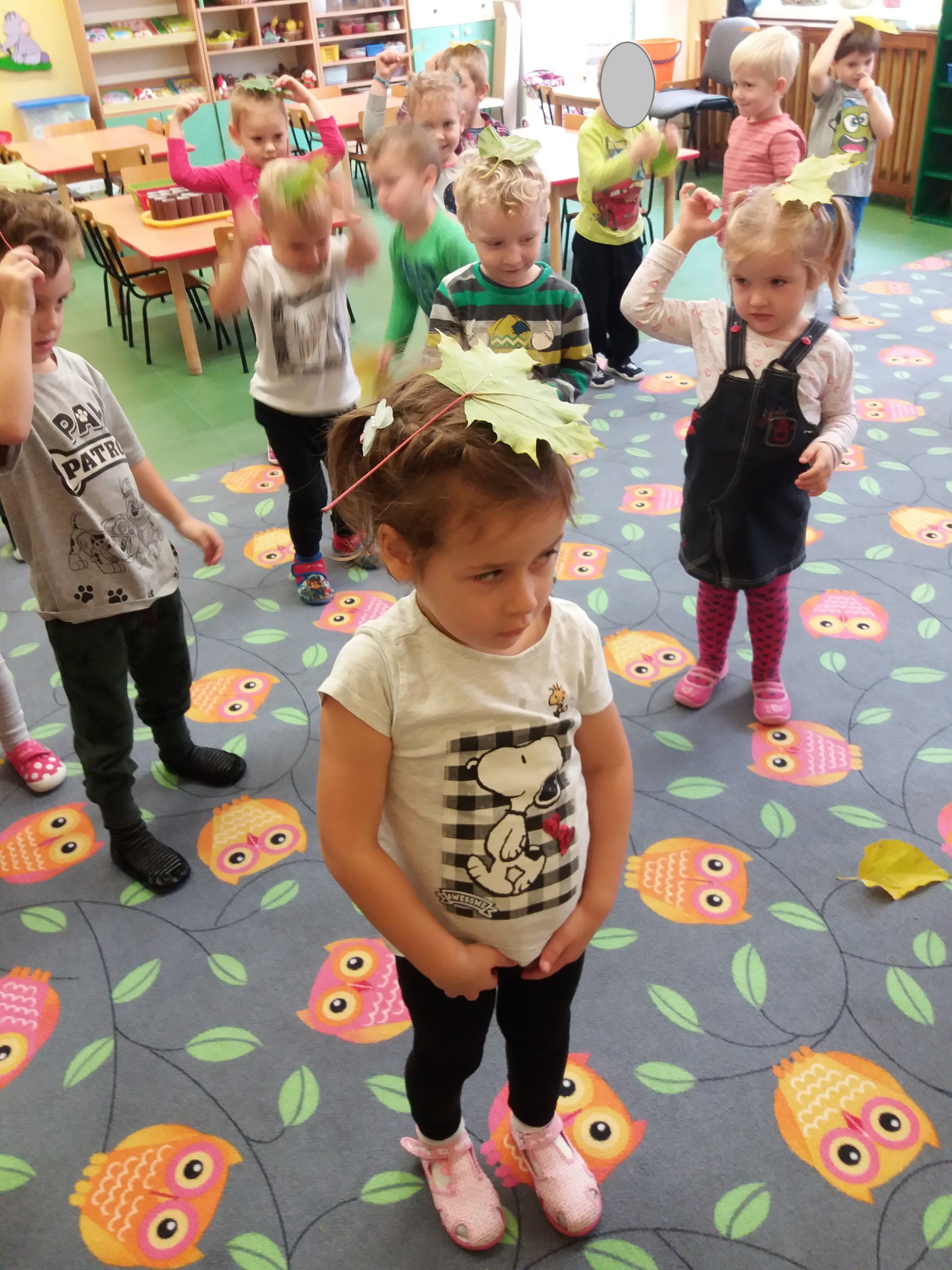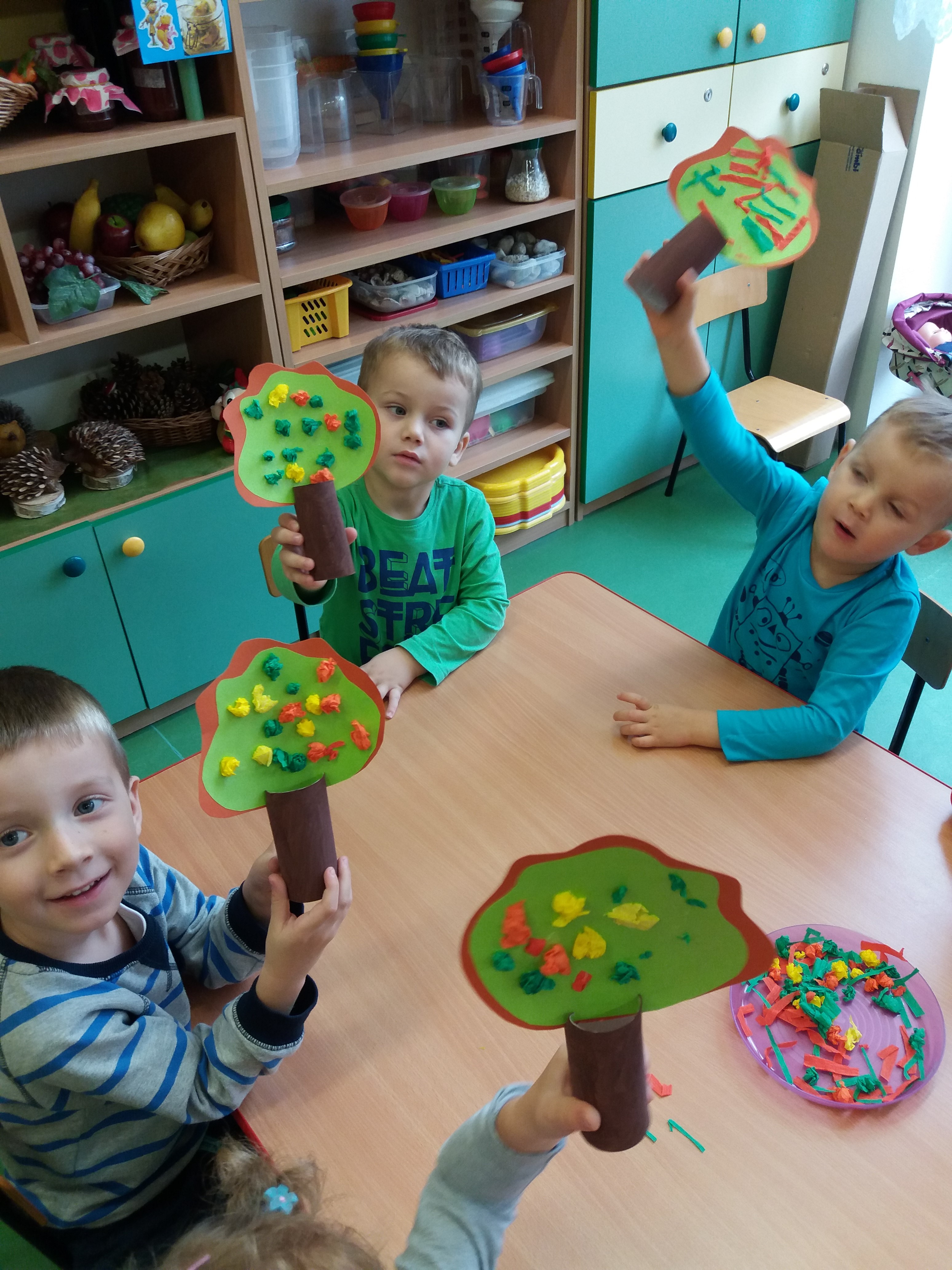Liście posłużyły także do twórczych zabaw ruchowych. Na zakończenie zajęć wykonaliśmy „Jesienne drzewo”.