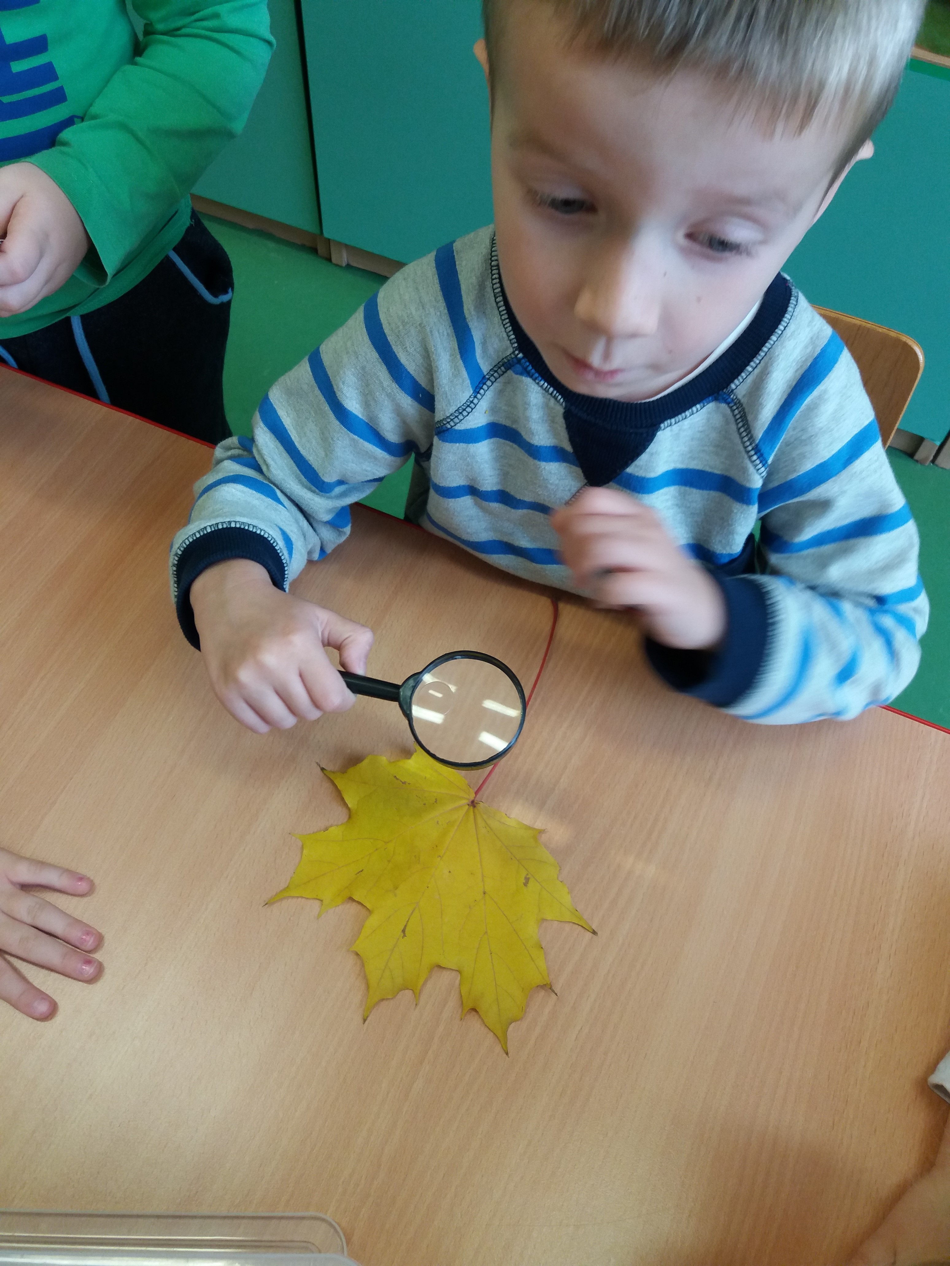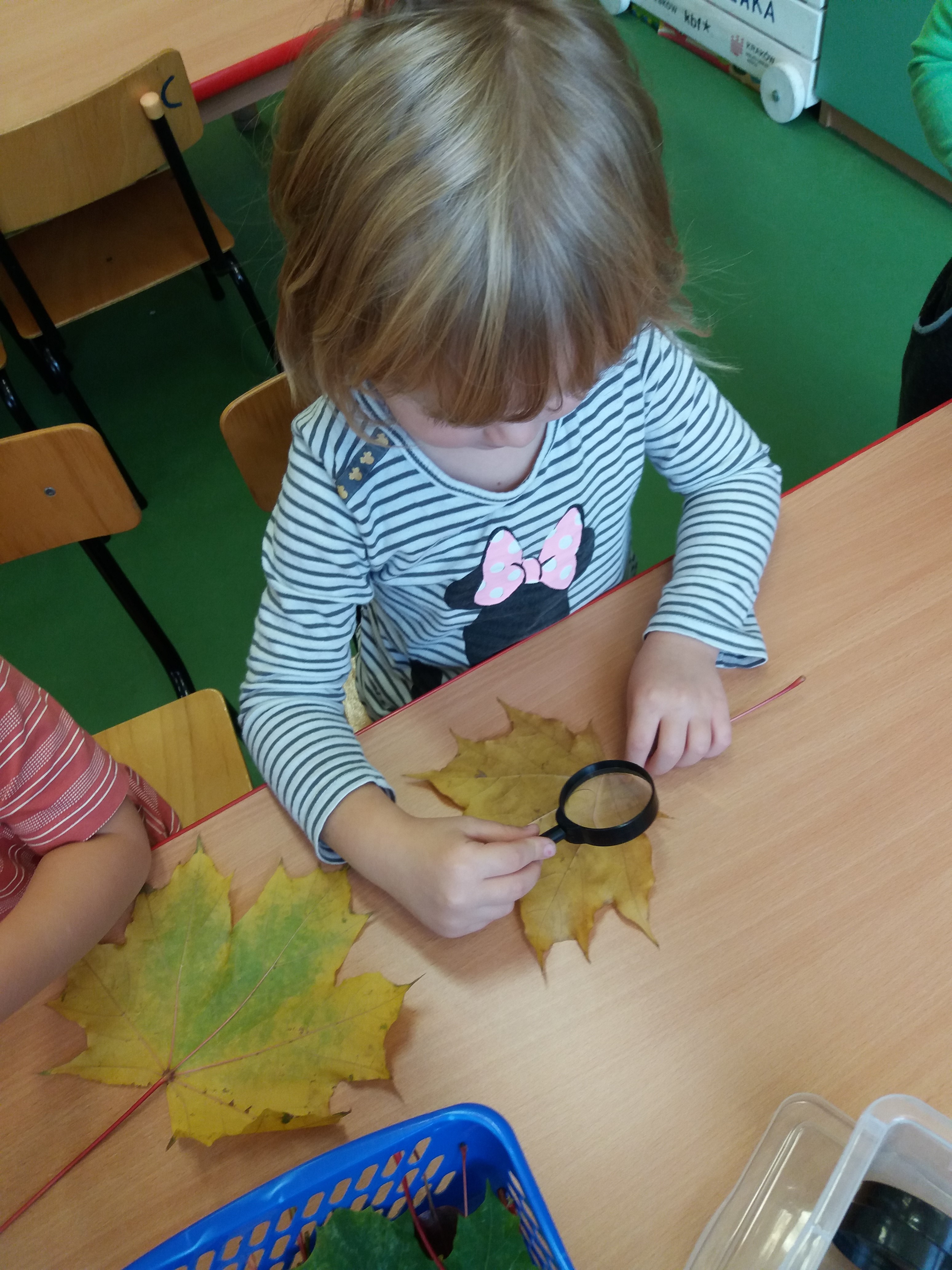 Poznaliśmy budowę liścia, wykorzystując do tego wrażenia dotykowe i wzrokowe. Badaliśmy je wnikliwie, wykorzystując również lupę.