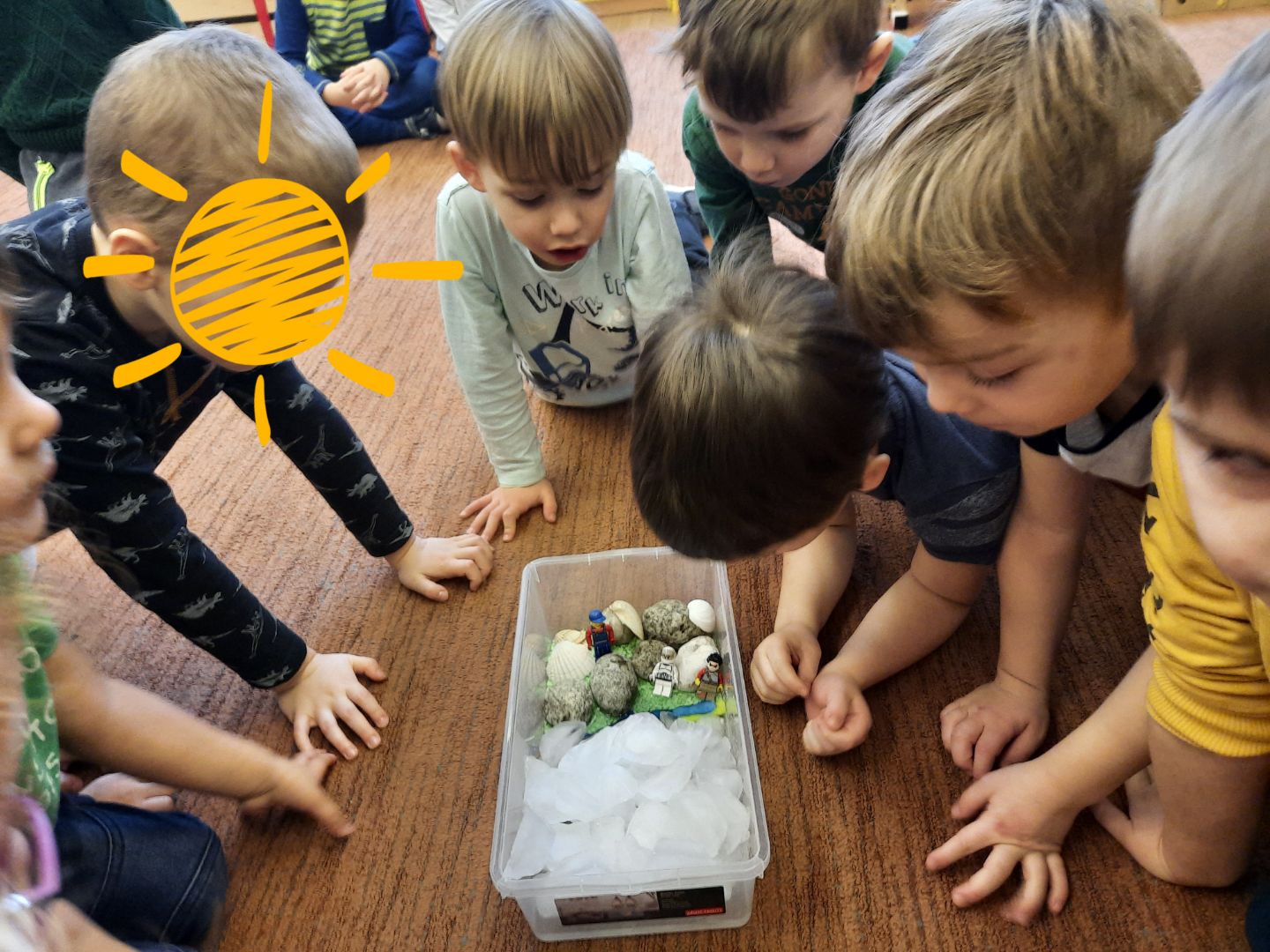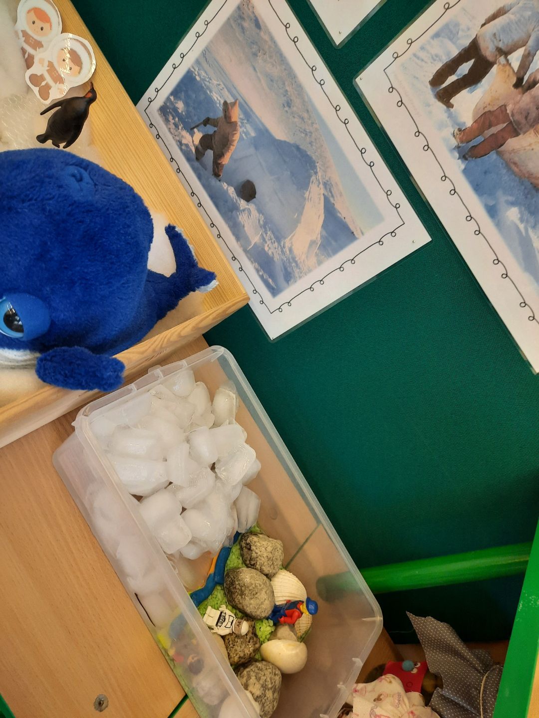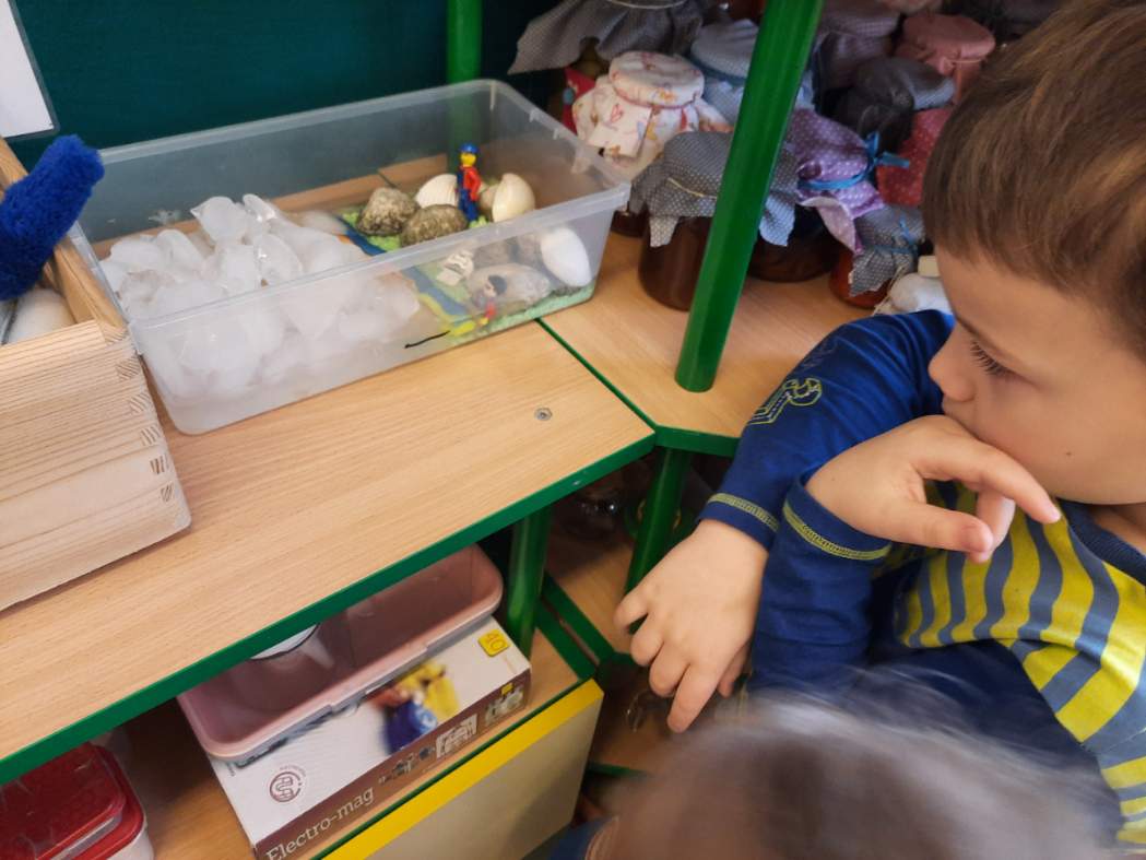 W trakcie realizacji tematu metodą projektu na temat „Arktyki i Antarktydy”, uwaga dzieci skupiła się na zjawisku ocieplenia klimatu i zawiązanym z nim zagadnieniem topnienia lodowców. Informacji na ten temat szukaliśmy w internecie, jak również w specjalistycznych książkach, które dzieci przynosiły z domów. Żeby pokazać dzieciom jak wielkim zagrożeniem dla przyszłego świata jest omawiane zjawisko przeprowadziliśmy zabawę badawczą. W plastikowej misce dzieci wykonały model wyspy z plasteliny, kamieni i muszli – na wyspie ustawiły ludziki z klocków Lego (symbolizujące jej mieszkańców), do pozostałej części miski dzieci wlały wodę (symbolizującą morze). W naszej misce znalazła się także ogromna bryła lodu (symbolizująca lodowiec). Dzieci obserwowały zmiany zachodzące na wyspie przez dwa dni – do czasu całkowitego rozpuszczenia lodu. Ostatecznie duża część wyspy znalazła się pod wodą, dzieci zadbały, by jej mieszkańcy zostali uratowani. Wszyscy klubowicze zgodnie stwierdzili, że ocieplenie klimatu jest bardzo niebezpieczne. Wszyscy musimy zacząć troszczyć się o nasz świat żyjąc ekologicznie.